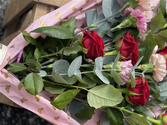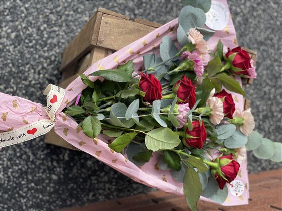 A beautiful flat bouquet ready to go in a vase with roses and carnations